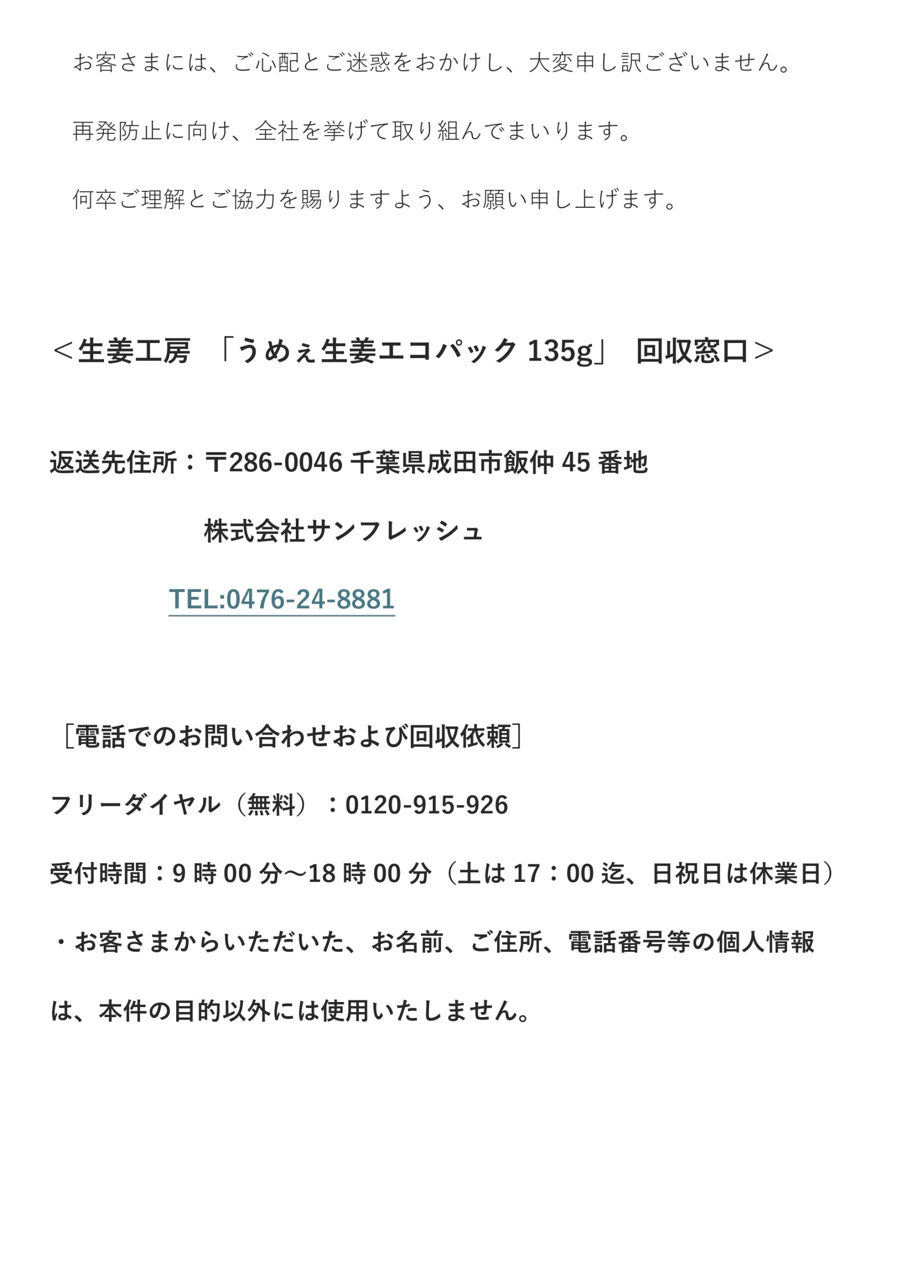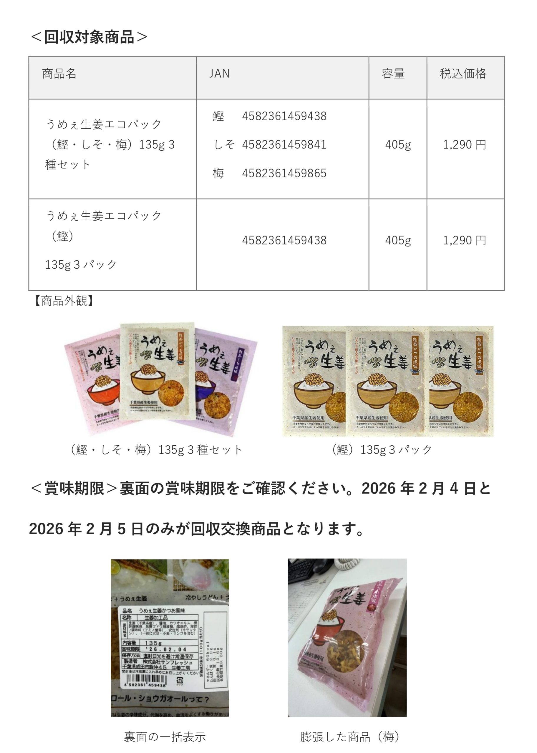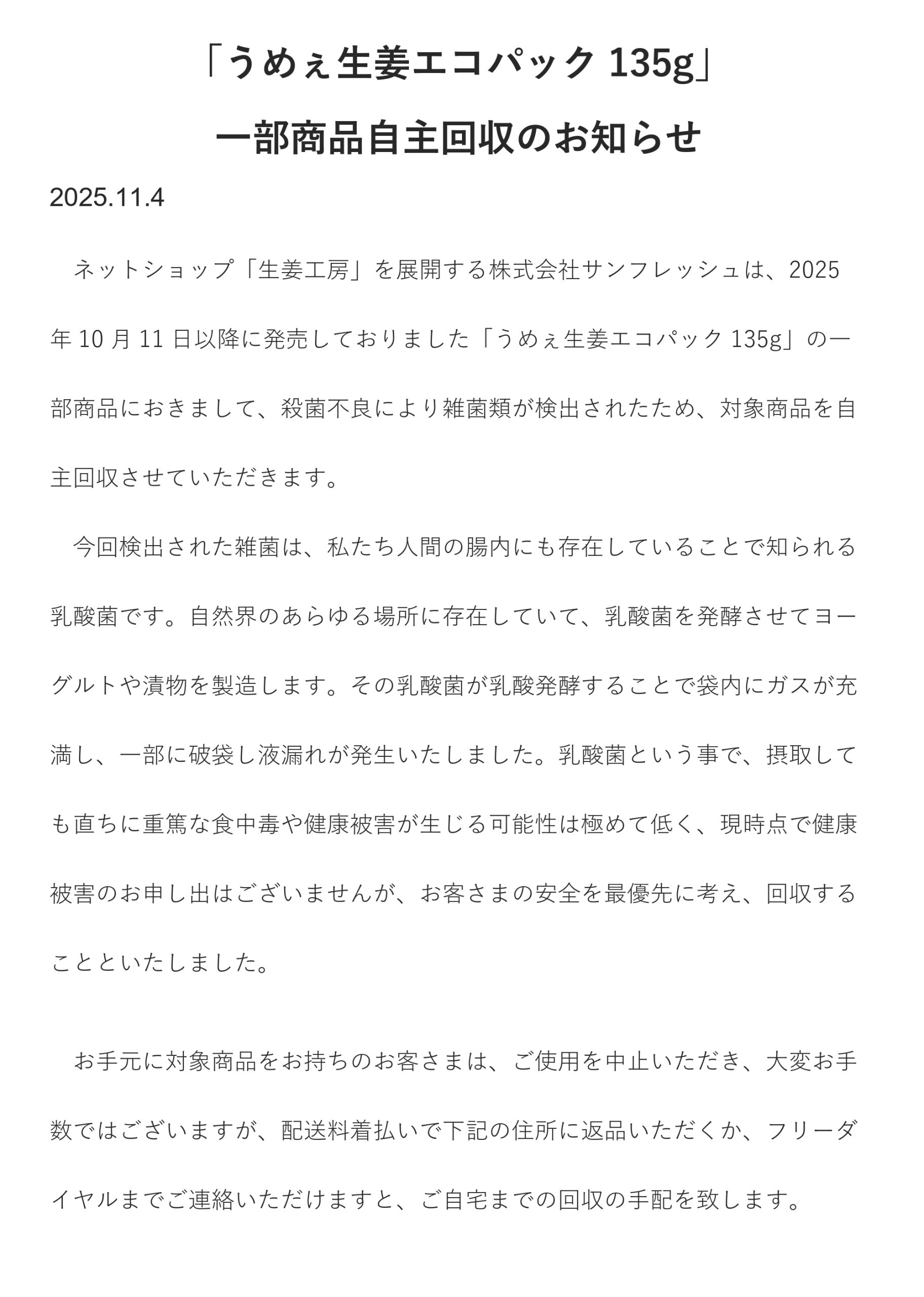 「うめぇ生姜エコパック135g」一部商品自主回収のお知らせ 2025年11月4日 関連記事 « 【10/4朝刊NIKKEIプラス1掲載内容紹介】ご飯をお代わりしたくて「しょうがない」 食べる生姜10品記事紹介